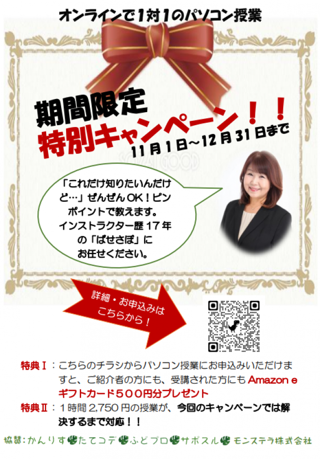 1対1オンラインでのパソコン授業 2025年11月1日〜2025年12月31日(オンライン): パソコン授業特別キャンペーン第2弾を開催いたします!「ぱせさぽ」は、あなたの「わからない」に寄り添った、あなただけのレッスンをご提供しています。...
