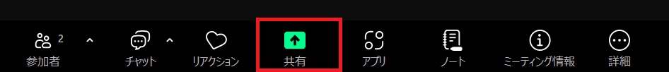 画面下の画面の共有のアイコンをクリックすることで行えます。