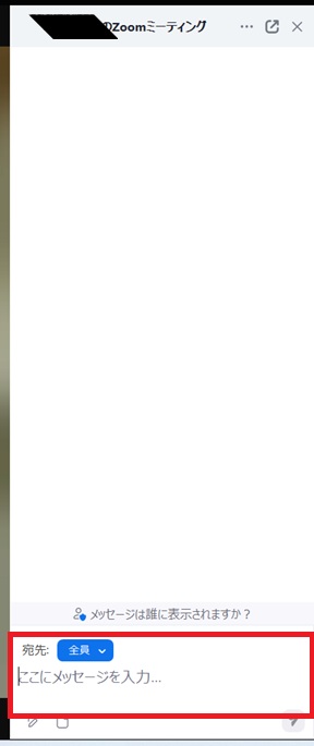 ① 宛先の隣の青いボタンをクリックし、チャットを送る人を指定する。特定の相手ではなく、全員に送りたい場合は、「全員」を指定しましょう。