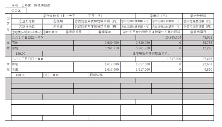 その年度の1月1日時点の土地や建物の価格(固定資産税評価額)が記載されます。固定資産税・都市計画税では、3年毎にこの価格が見直されます。